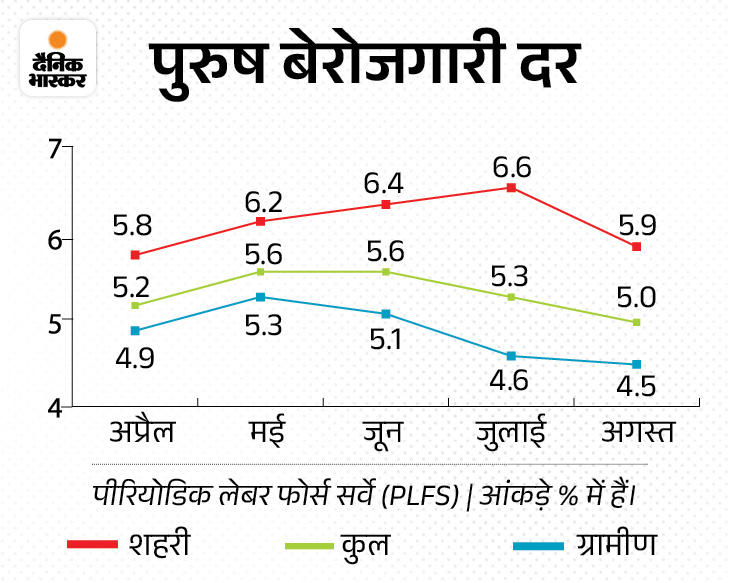 - ग्रामीण क्षेत्रों में पुरुषों की बेरोजगारी दर जुलाई के 4.6% से अगस्त में घटकर 4.5% हो गई।