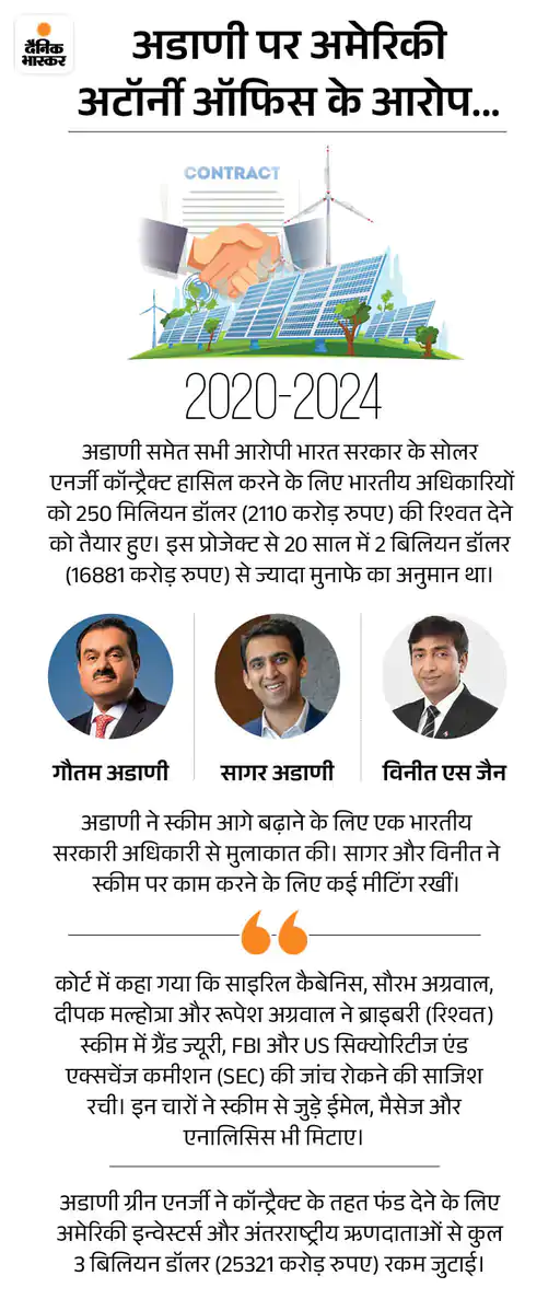 SEC का आरोप है कि अडाणी ग्रीन एनर्जी ने अमेरिकी निवेशकों से फंड जुटाते समय गलत जानकारियां दीं। इसके अलावा, अमेरिकी अभियोजकों यानी प्रॉसिक्यूटर्स ने एक अलग क्रिमिनल केस में अडाणी पर भारत में सोलर पावर कॉन्ट्रैक्ट हासिल करने के लिए 265 मिलियन डॉलर (करीब 2,429 करोड़ रुपए) की रिश्वत देने की साजिश का आरोप भी लगाया है। हालांकि, अडाणी ग्रुप ने इन सभी आरोपों को सिरे से खारिज करते हुए इन्हें बेबुनियाद बताया है।