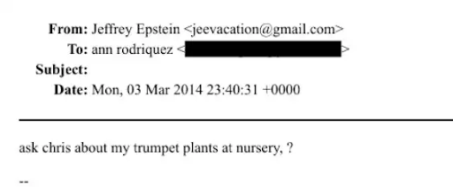 यह ईमेल सीधे एपस्टीन ने ‘एन रोड्रिगेज’ नाम के एक व्यक्ति को भेजा था। ईमेल में उन्होंने लिखा था कि नर्सरी में लगे उनके ट्रम्पेट पौधों के बारे में क्रिस से पूछो। इससे साफ संकेत मिलता है कि एपस्टीन की नर्सरी में ट्रम्पेट प्लांट यानी धतूरा के पौधे लगे हुए थे।
