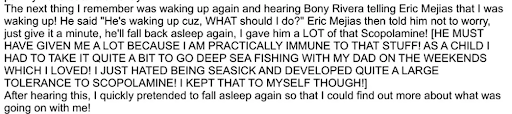 बयान में साफ तौर पर स्कोपोलामीन का नाम लिया गया है। मंजारो का आरोप है कि उन्हें ले जा रहे दो लोगों में से एक ने कहा था, “मैंने उसे काफी मात्रा में स्कोपोलामीन दे दिया है।” इसके बाद उसने याददाश्त खोने और बेहद ज्यादा नींद आने जैसी हालत का दावा किया है।