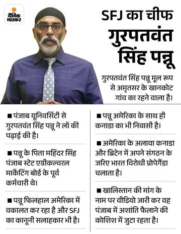SFJ चीफ गुरपतवंत सिंह पन्नू को भारत सरकार ने 2020 में आतंकवादी घोषित किया था। उसके खिलाफ भारत में कुल 104 मामले दर्ज हो चुके हैं। इनमें से 96 मामले अलग-अलग राज्यों में पुलिस और 8 मामले राष्ट्रीय जांच एजेंसी (NIA) ने दर्ज किए हैं।