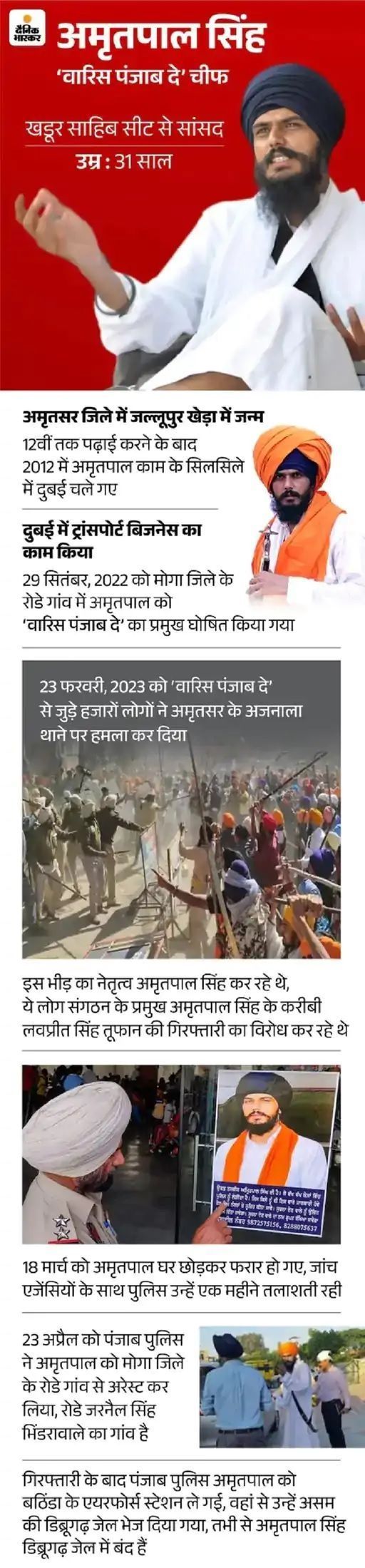 NSA के तहत डिब्रूगढ़ जेल में बंद अमृतपाल सिंह इस समय NSA (राष्ट्रीय सुरक्षा कानून) के तहत डिब्रूगढ़ जेल, असम में बंद हैं। साल 2024 में उन्होंने जेल से चुनाव लड़ा और खडूर साहिब सीट से लगभग 2 लाख वोटों से जीतकर सांसद बने।