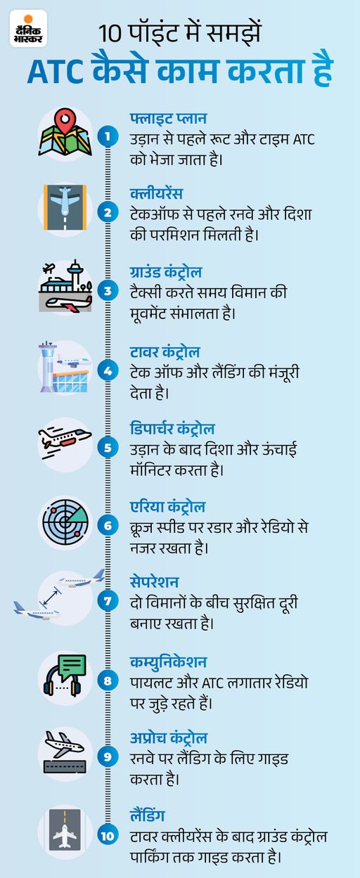 एयर ट्रैफिक कंट्रोल (ATC) एयरपोर्ट्स पर मौजूद सेंट्रल कंट्रोलिंग सिस्टम होता है। यह हवाई जहाजों को जमीन पर, हवा में और आसमान के अलग-अलग हिस्सों में निर्देश जारी करता है। आसान भाषा में कहा जाए तो यह ट्रैफिक पुलिस की तरह ही है, लेकिन सिर्फ हवाई जहाजों के लिए।