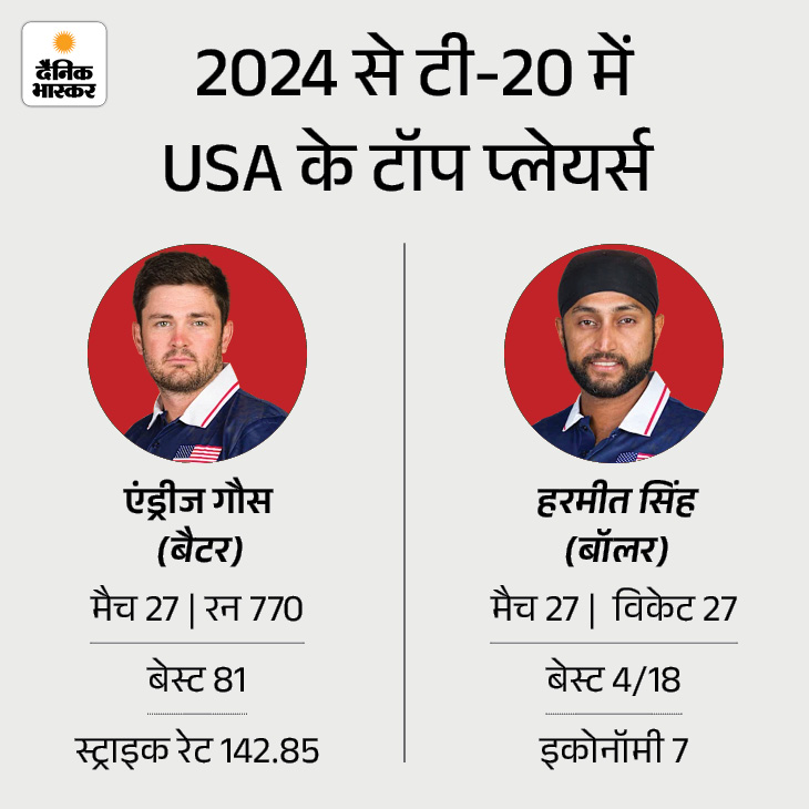 गौस USA के टॅाप रन स्कोरर 2024 के बाद से एंड्रीज गौस ने USA के लिए सबसे ज्यादा रन बनाए हैं। वे 27 मुकाबलों में 770 रन बना चुके हैं। तेज गेंदबाज हरमीत सिंह 27 विकेट लेकर टीम के टॅाप बॅालर बने हुए हैं।