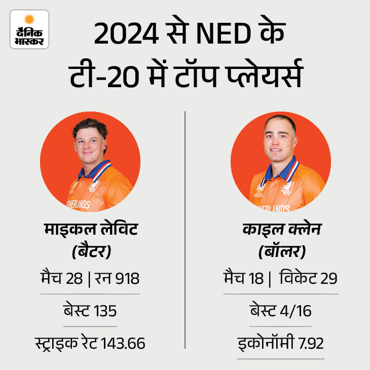 लेविट नीदरलैंड के टॅाप रन स्कोरर नीदरलैंड से माइकल लेविट ने 2024 के बाद से 918 रन बनाए हैं। उनका बेस्ट स्कोर 135 रन हैं। गेंदबाजों में काइल क्लीन 29 विकेट लेकर टॅाप बॅालर हैं।