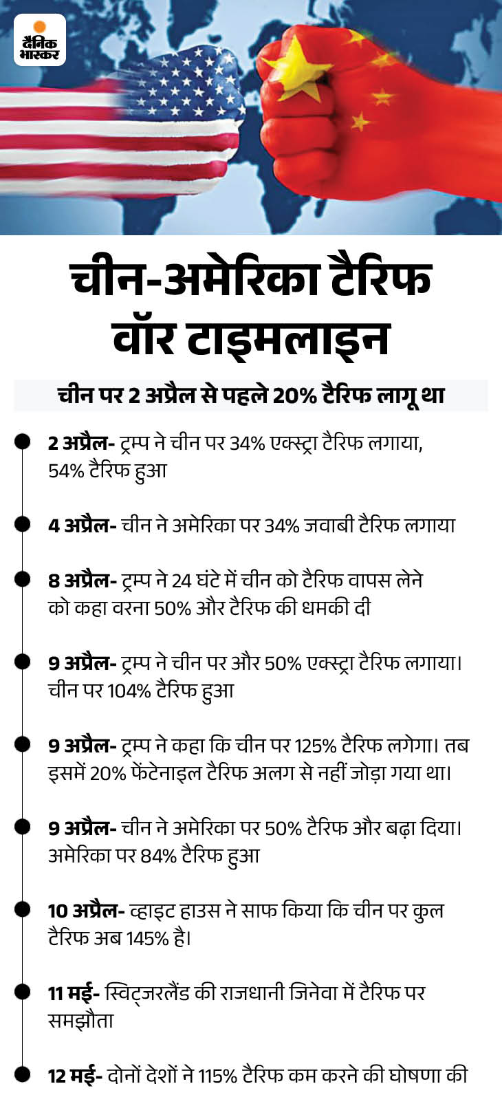 जिनेवा में दोनों देशों के बीच हुए समझौते के मुताबिक अमेरिका, चीनी सामानों पर 30% टैरिफ लगाएगा। वहीं चीन, अमेरिकी सामानों पर 10% टैरिफ लगाएगा। दोनों देशों के बीच टैरिफ में यह कटौती फिलहाल 90 दिनों के लिए हुई।