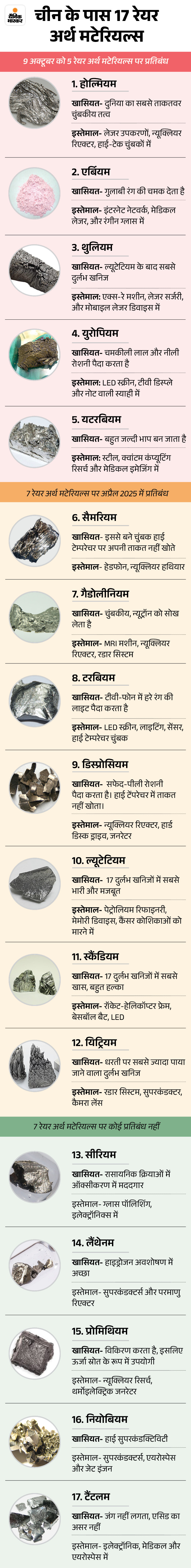 चीन के पास दुनिया के 17 दुर्लभ खनिज (रेयर अर्थ मटेरियल्स) हैं, जिन्हें वह दुनिया को निर्यात करता है। इनका इस्तेमाल इलेक्ट्रॉनिक सामान, EVs और डिफेंस सेक्टर में होता है। चीन ने पहले से 7 दुर्लभ खनिजों पर कंट्रोल कर रखा था, लेकिन 9 अक्टूबर को इसमें 5 और (होल्मियम, एर्बियम, थुलियम, यूरोपियम और यटरबियम) जोड़ दिए गए।