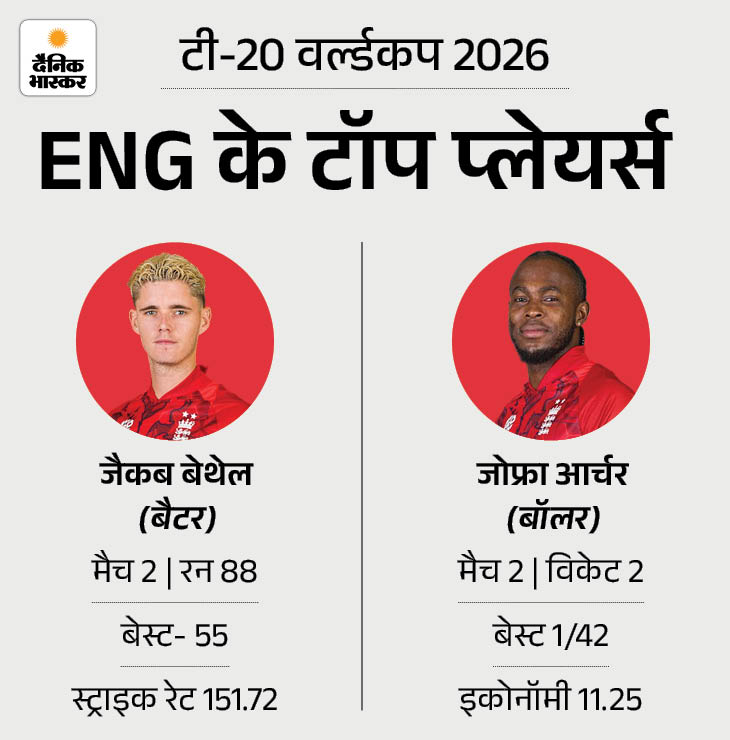 जोफ्रा आर्चर गेंदबाजी में आगे टी-20 वर्ल्ड कप में जैकब बेथेल ने इंग्लैंड के लिए सबसे ज्यादा रन बनाए हैं। वे 2 मुकाबलों में 88 रन बना चुके हैं। तेज गेंदबाज जोफ्रा आर्चर 2 विकेट लेकर टीम के टॅाप बॅालर बने हुए हैं।
