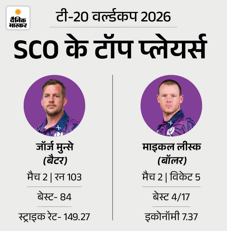 जॉर्ज मुन्से स्कॉटलैंड के टॉप रन स्कोरर स्कॉटलैंड के लिए जॉर्ज मुन्से ने वर्ल्ड कप में सबसे ज्यादा 103 रन बनाए हैं। उनका बेस्ट स्कोर 84 रन हैं। गेदबाजी में माइकल लीस्क 5 विकेट ले चुके हैं।