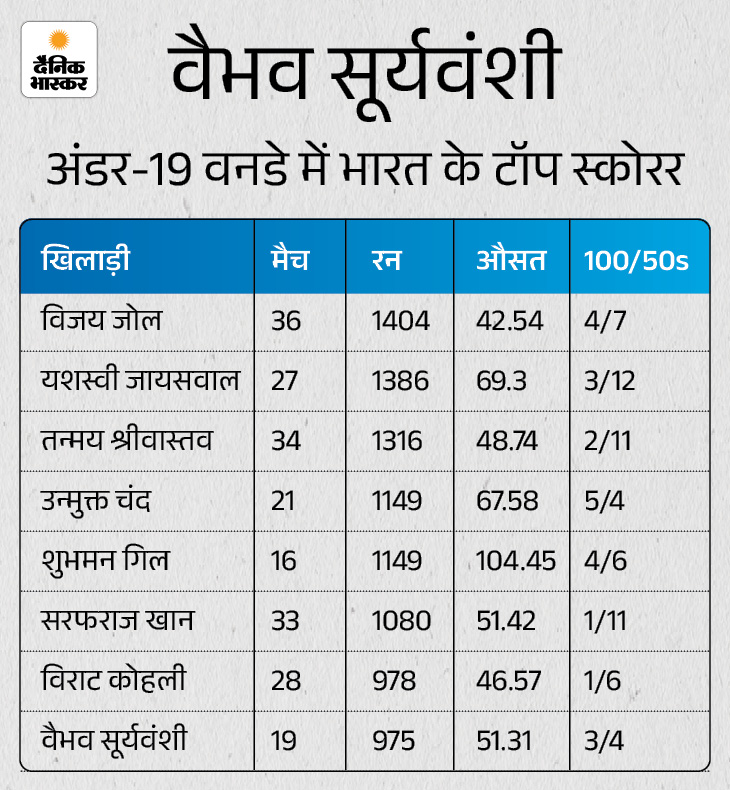 यूथ वनडे में भारत के टॉप स्कोरर की लिस्ट में वैभव सूर्यवंशी 8वें नंबर पर हैं। उनके नाम 19 मैचों में 975 रन हैं। वे विराट कोहली से 3 रन पीछे हैं। विराट ने 28 मैचों में 978 रन बनाए हैं।