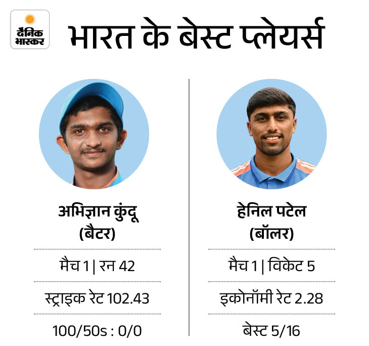 इस टूर्नामेंट में भारत ने एक मैच ही खेला है। इस मैच में अभिज्ञान कुंदू ने 42 रन बनाए थे। वहीं, दाएं हाथ के तेज गेंदबाज हेनिल पटेल ने सात ओवरों में 16 रन देकर पांच विकेट लिए हैं।