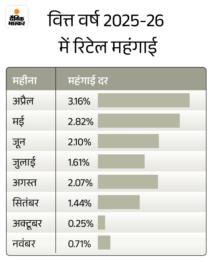 आज यानी 12 जनवरी को दिसंबर महीने के रिटेल महंगाई (CPI) के आंकड़े जारी होंगे। एक्सपर्ट्स के अनुसार दिसंबर 2025 में खुदरा महंगाई बढ़कर 1.6% से 1.7% के बीच रहने की संभावना है। इससे पहले नवंबर में ये 0.71% पर थी। वहीं अक्टूबर में ये 0.25% पर थी, जो 14 साल में सबसे कम स्तर रहा था।