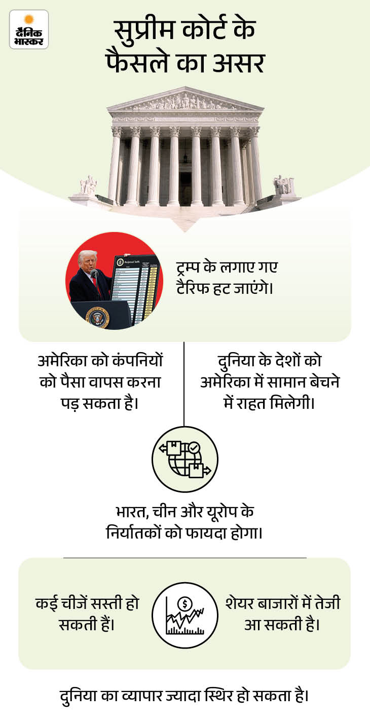 इस फैसले का असर भारत पर भी पड़ेगा। पिछले एक साल में अमेरिका ने भारतीय सामान पर लगने वाला टैक्स कई बार बदला है। पहले करीब 26% था, फिर बढ़ाकर 50% तक कर दिया गया। उसके बाद इसे घटाकर 18% किया गया और अब कोर्ट के फैसले के बाद यह 15% वाले ग्लोबल टैरिफ में आ गया है।