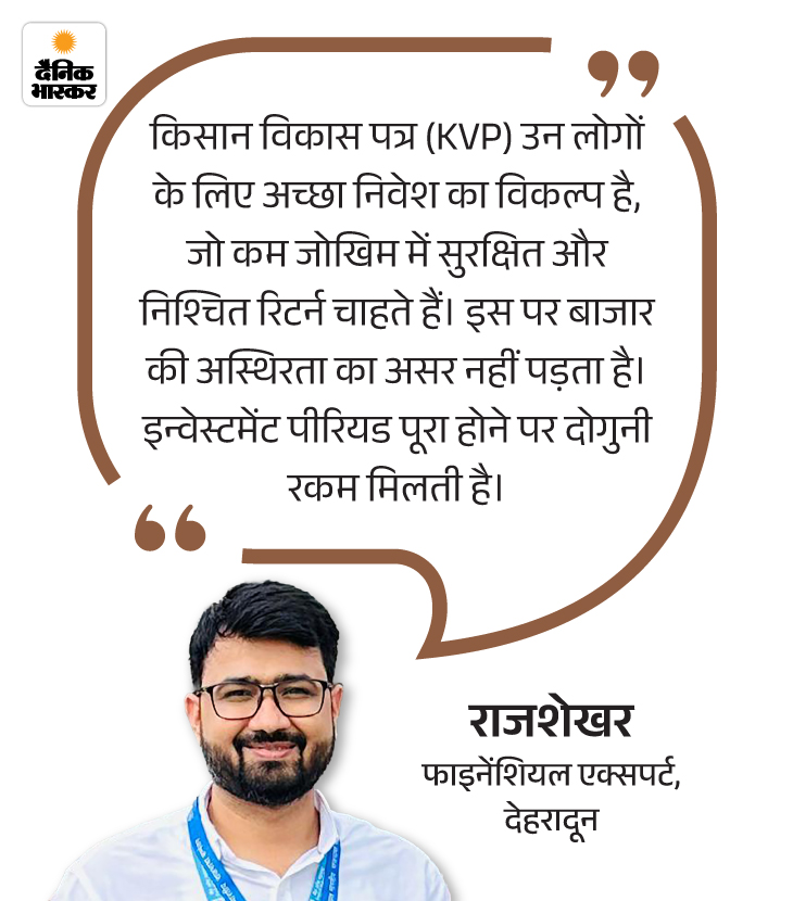 हालांकि, सुरक्षित और तय रिटर्न वाली एक ऐसी ही सरकारी स्मॉल सेविंग स्कीम है, किसान विकास पत्र (KVP)। यह कम रिस्क वाला निवेश विकल्प है, जिसमें निवेश की गई राशि तय अवधि में लगभग दोगुनी हो जाती है।