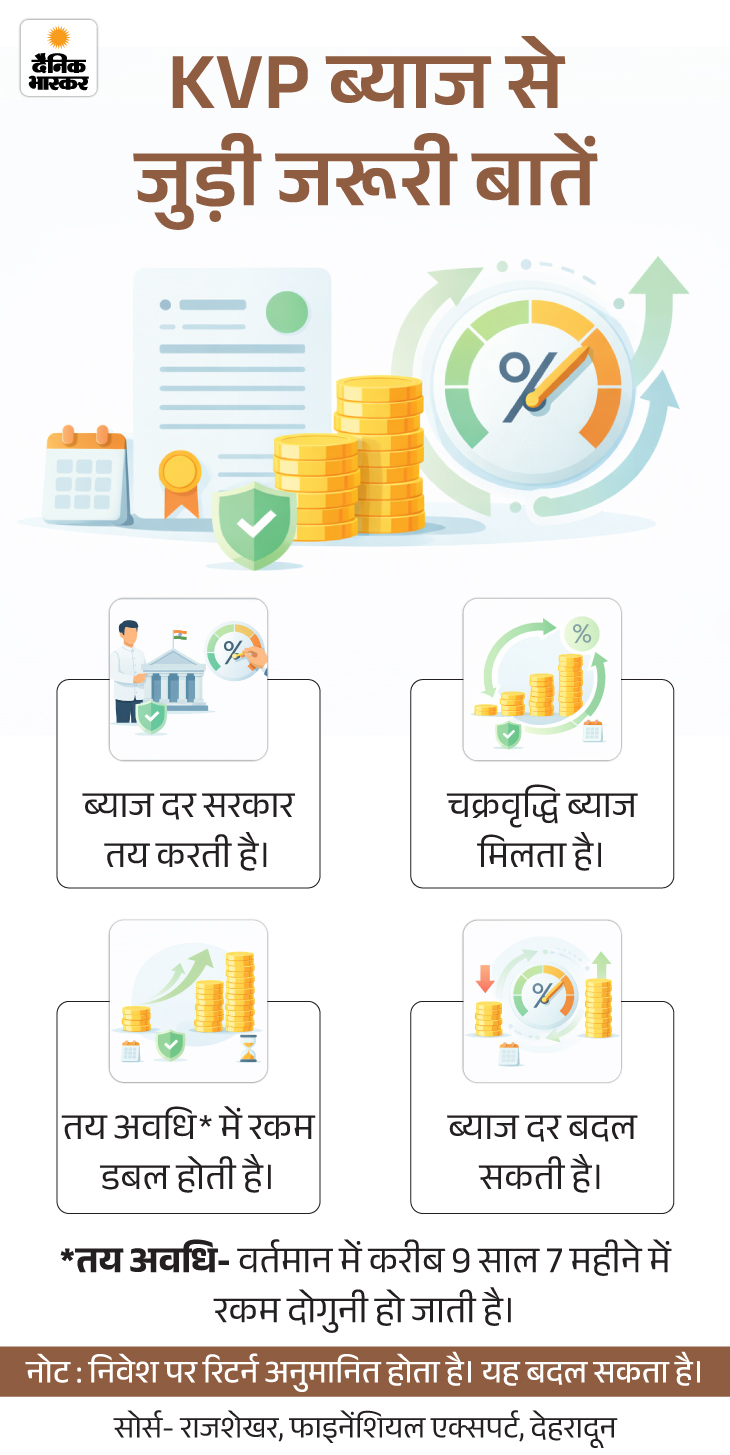 जवाब- KVP पर ब्याज दर सरकार हर तिमाही में तय करती है। साल 2024-25 के अनुसार इस पर लगभग 7.5% सालाना चक्रवृद्धि ब्याज मिल रहा है। चक्रवृद्धि ब्याज का मतलब है कि हर साल मिलने वाला ब्याज मूलधन में जुड़ जाता है और अगले साल उसी पर ब्याज मिलता है। इसी वजह से तय समय पूरा होने पर निवेश राशि दोगुनी हो जाती है।