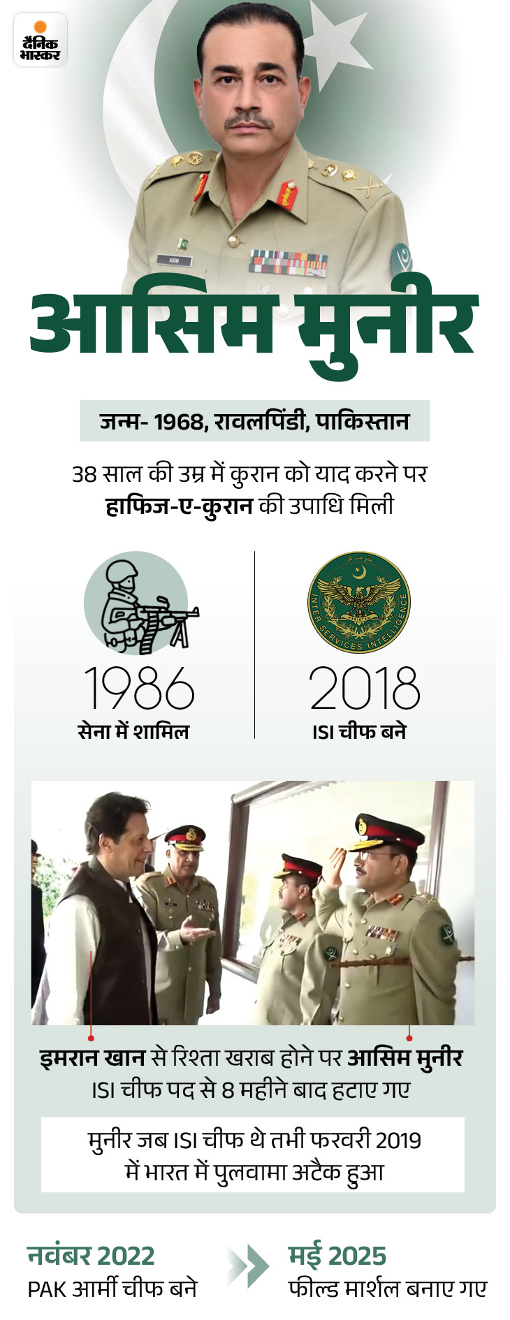 आसिम मुनीर अपने पहले के सेना प्रमुखों से काफी अलग माने जाते हैं। पहले के ज्यादातर सेना प्रमुख पश्चिमी सैन्य संस्थानों में प्रशिक्षित पेशेवर सैनिक थे, जो धर्म और राजनीति से दूरी बनाए रखते थे। इसके उलट आसिम मुनीर हाफिज-ए-कुरान हैं और मजहब उनकी पब्लिक इमेज का अहम हिस्सा है। वह पाकिस्तान के ऐसे पहले अधिकारी हैं, जिन्होंने मिलिट्री इंटेलिजेंस और ISI दोनों की लीडरशिप की है।