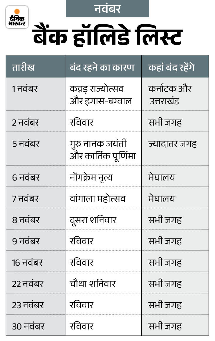इस महीने 11 दिन बैंक बंद रहेंगे:  नवंबर में 5 रविवार-2 शनिवार के अलावा अलग-अलग जगहों पर 4 दिन बैंकों में कामकाज नहीं होगा Business News & Hub