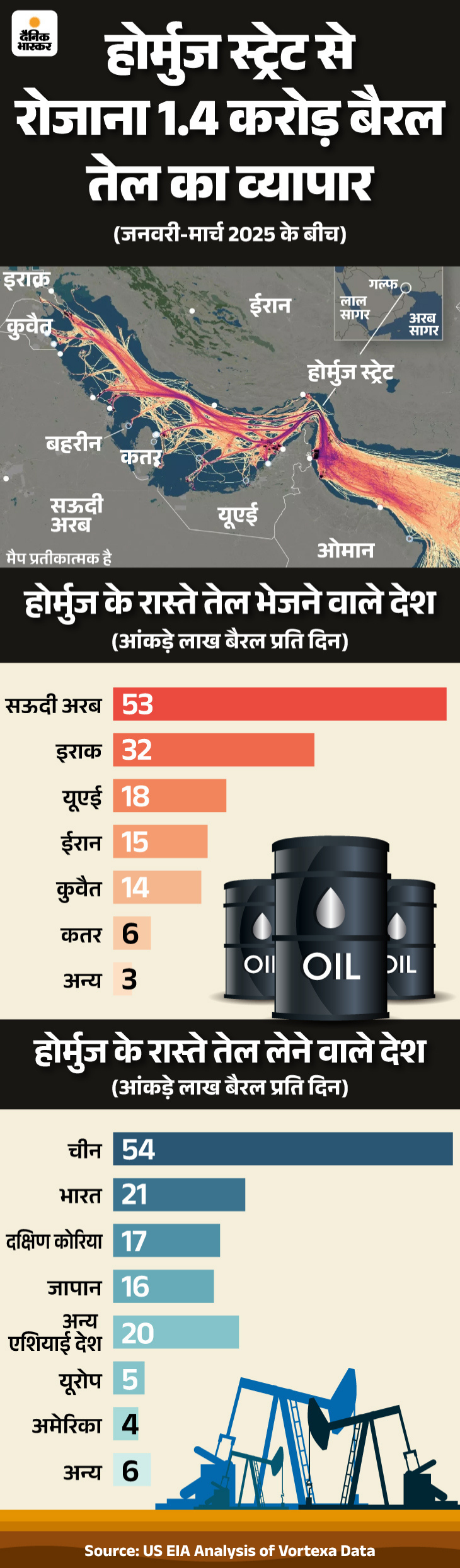 अमेरिका के एनर्जी इन्फॉर्मेशन एडमिनिस्ट्रेशन यानी EIA के मुताबिक, दुनिया के कुल पेट्रोलियम में से करीब 20% होर्मुज स्ट्रेट से होकर गुजरता है। हर दिन लगभग 1.78 करोड़ बैरल से 2.08 करोड़ बैरल कच्चा तेल और ईंधन इस रूट से जाता है। इंटरनेशनल एनर्जी एजेंसी यानी IEA के मुताबिक, ईरान खुद रोजाना 17 लाख बैरेल पेट्रोलियम इस रूट से निर्यात करता है। इस रास्ते से गुजरने वाली कॉमर्शियल शिप की सुरक्षा अमेरिकी नेवी की एक टुकड़ी करती है।