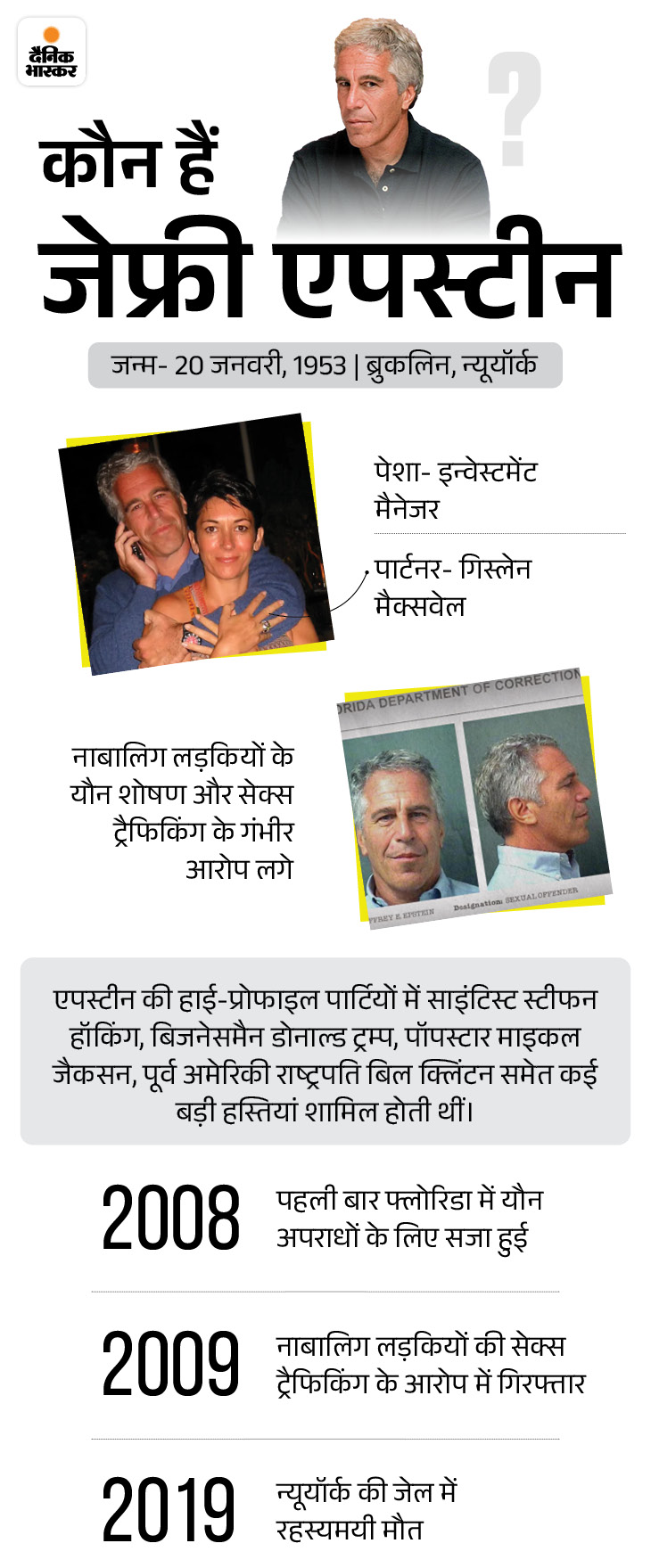 जेफ्री एपस्टीन न्यूयॉर्क का करोड़पति फाइनेंसर था। उसकी बड़े नेताओं और सेलिब्रिटीज से दोस्ती थी। उस पर 2005 में नाबालिग लड़की के साथ यौन उत्पीड़न का आरोप लगा। 2008 में उसे नाबालिग से सेक्स की मांग करने का दोषी ठहराया गया।