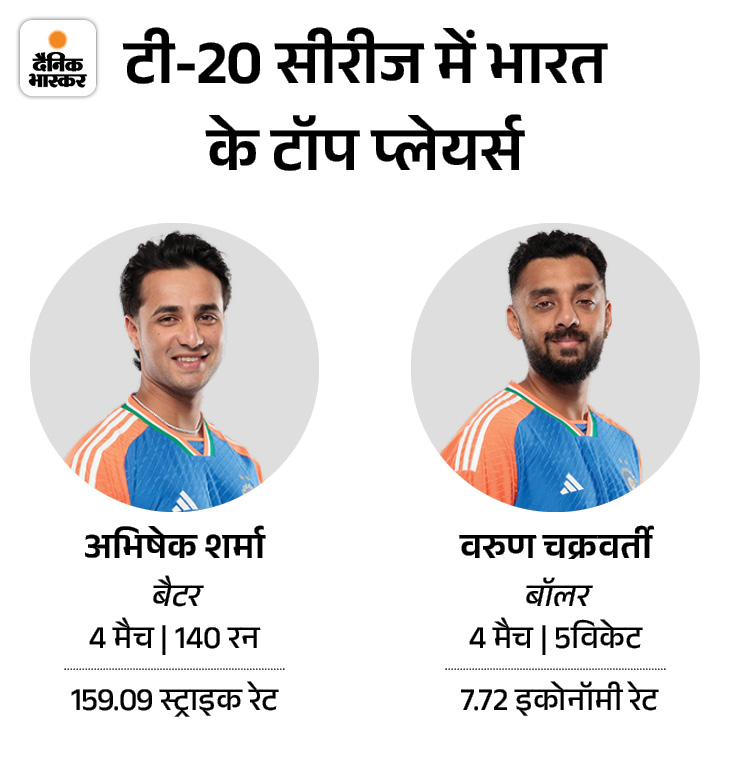 अभिषेक दिला रहे तूफानी शुरुआत टी-20 सीरीज के सभी मैचों में भारत को अभिषेक शर्मा ने तूफानी शुरुआत दिलाई है। वे 4 मुकाबलों में 159.09 के स्ट्राइक रेट से 140 रन बना चुके हैं। वरुण चक्रवर्ती 5 विकेट लेकर टीम के टॉप गेंदबाज बने हुए हैं। प्लेइंग-11 में बदलाव होने की संभावना कम ही है। एक्सपेरिमेंट के लिए शुभमन गिल की जगह संजू सैमसन से ओपनिंग कराई जा सकती है। शुभमन को 14 नवंबर से साउथ अफ्रीका के खिलाफ टेस्ट सीरीज भी खेलना है, ऐसे में उन्हें आराम दिया जा सकता है।