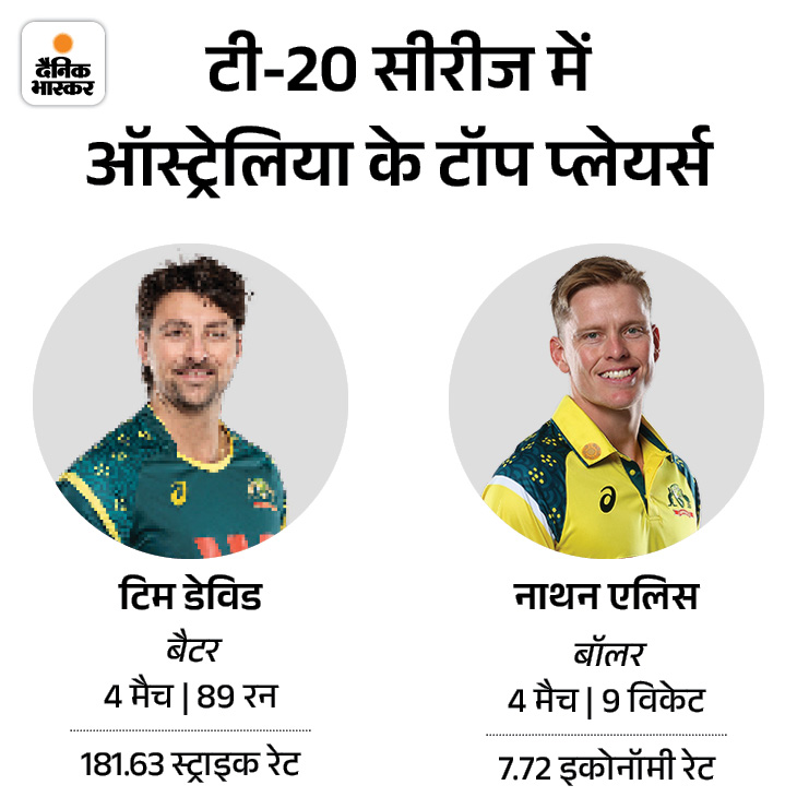 ऑस्ट्रेलिया का कोई प्लेयर 100 रन नहीं बना सका टी-20 सीरीज में ऑस्ट्रेलिया की बैटिंग फ्लॉप रही। टिम डेविड 89 रन बनाकर सीरीज में टीम के टॉप स्कोरर हैं। कप्तान मिचेल मार्श भी टीम को मजबूत शुरुआत नहीं दिला पा रहे हैं। गेंदबाजी में नाथन एलिस और एडम जम्पा से ही टीम को फिर एक बार उम्मीदें रहेंगी।