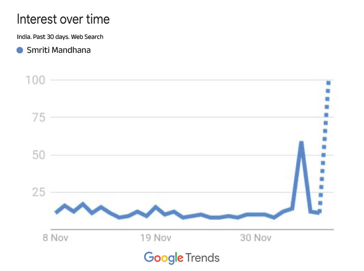 स्मृति मंधना गूगल के टॉप ट्रेंड पर ऑस्ट्रेलिया ने भारत को दूसरे वनडे में 122 रन से हराया। इस मैच में मंधना केवल 9 रन बना सकी, जिसके बाद वह गूगल के टॉप ट्रेंड में आ रही है। नीचे देखें गूगल ट्रेंड्स