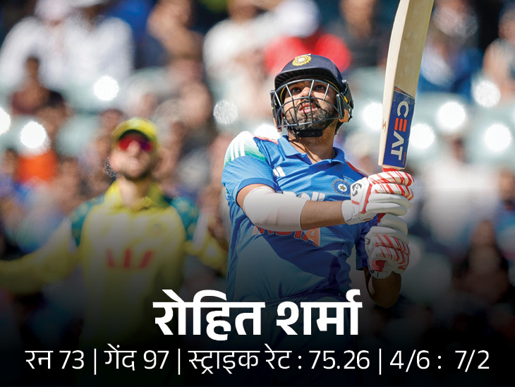 30वें ओवर में भारत का तीसरा विकेट गिरा। यहां पर रोहित शर्मा 73 रन बनाकर आउट हुए। उन्हें मिचेल स्टार्क ने जोश हेजलवुड के हाथों कैच कराया। रोहित ने वनडे करियर का 59वां अर्धशतक लगाया है।