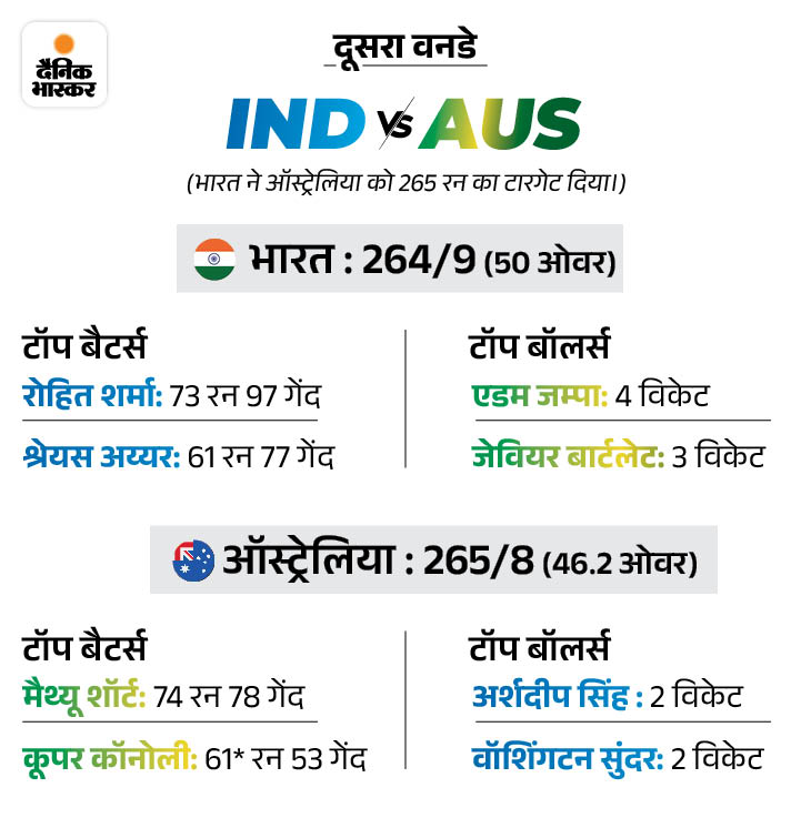 जवाब में ऑस्ट्रेलिया ने 46.2 ओवर में 8 विकेट खोकर टारगेट चेज कर लिया। मैथ्यू शॉर्ट ने सबसे ज्यादा 74 रन बनाए। कूपर कोनोली 61 रन बनाकर नाबाद लौटे। भारत से अर्शदीप सिंह, वाशिंगटन सुंदर और हर्षित राणा ने 2-2 विकेट लिए। तीसरा वनडे 25 अक्टूबर को सिडनी में खेला जाएगा।