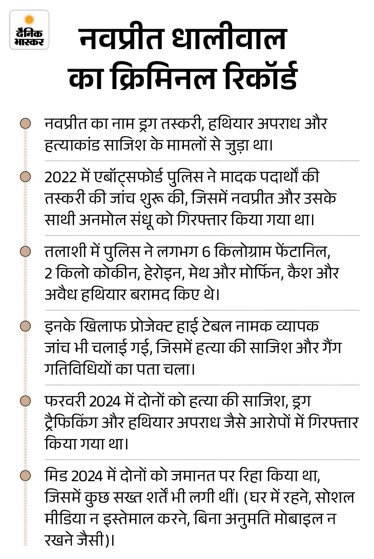 नवप्रीत धालीवाल पर कई मामले दर्ज नवप्रीत धालीवाल का नाम इससे पहले भी कई गंभीर मामलों में सामने आ चुका था। एबॉट्सफोर्ड पुलिस के मुताबिक नवप्रीत व उसका साथी BC गैंग कनफ्लिक्ट से जुड़े थे, जो जमानत पर रिहा होने के बाद वेस्ट एबॉट्सफोर्ड में रह रहे थे।