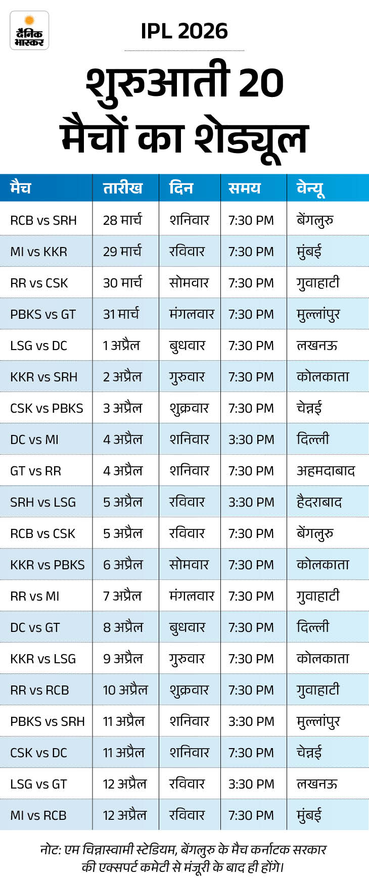 28 मार्च से होगी IPL-2026 की शुरुआत IPL 2026 की शुरुआत 28 मार्च से होगी। पहले मैच में डिफेंडिंग चैंपियन रॉयल चैलेंजर्स बेंगलुरु और सनराइजर्स हैदराबाद आमने-सामने होंगी। दिल्ली कैपिटल्स अपना पहला मैच 1 अप्रैल को लखनऊ सुपर जायंट्स के खिलाफ लखनऊ के एकाना स्टेडियम में खेलेगी, जबकि टीम का पहला होम मैच 4 अप्रैल को मुंबई इंडियंस के खिलाफ होगा।