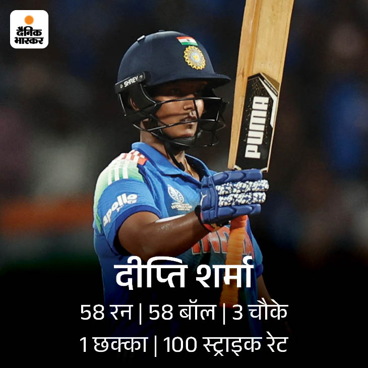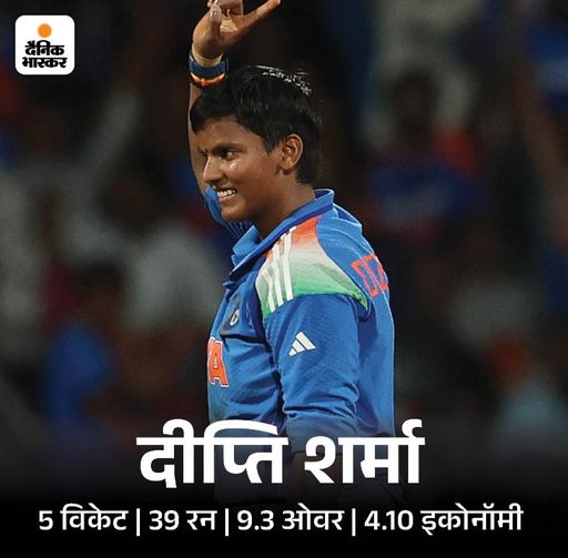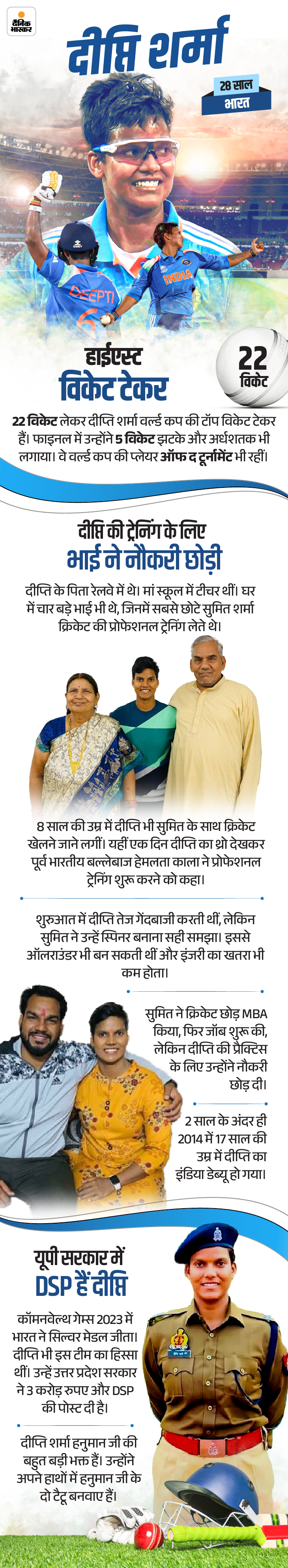 दीप्ति इस वर्ल्ड कप की टॉप विकेट टेकर दीप्ति विमेंस वर्ल्ड कप के एक सीजन में भारत की हाईएस्ट विकेट टेकर दीप्ति शर्मा विमेंस वर्ल्ड कप के एक सीजन में भारत के लिए सबसे ज्यादा विकेट लेने वालीं बॉलर बनीं। उनके नाम अब 22 विकेट रहे। दीप्ति ने शशिकला कुलकर्णी का रिकॉर्ड ब्रेक किया। उन्होंने 1981 में 20 विकेट लिए थे।