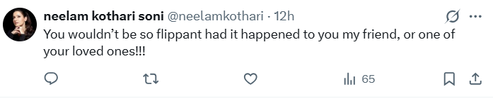 जब एक यूजर ने नीलम को ही जिम्मेदार ठहराने की कोशिश की, तो उन्होंने जवाब दिया, “अगर ऐसा तुम्हारे या तुम्हारे अपने के साथ होता, तो तुम ऐसा नहीं कहते।”