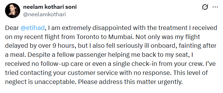नीलम ने पोस्ट में आगे लिखा, “एक यात्री ने मुझे सीट तक वापस बैठने में मदद की, लेकिन आपके क्रू मेंबर ने एक बार भी हालचाल नहीं पूछा और न कोई मदद की। मैंने आपकी कस्टमर सर्विस से भी संपर्क करने की कोशिश की, लेकिन वहां से भी कोई जवाब नहीं मिला। इस तरह की लापरवाही बिल्कुल अस्वीकार्य है। कृपया इस मामले को जल्दी से देखें और कार्रवाई करें।”