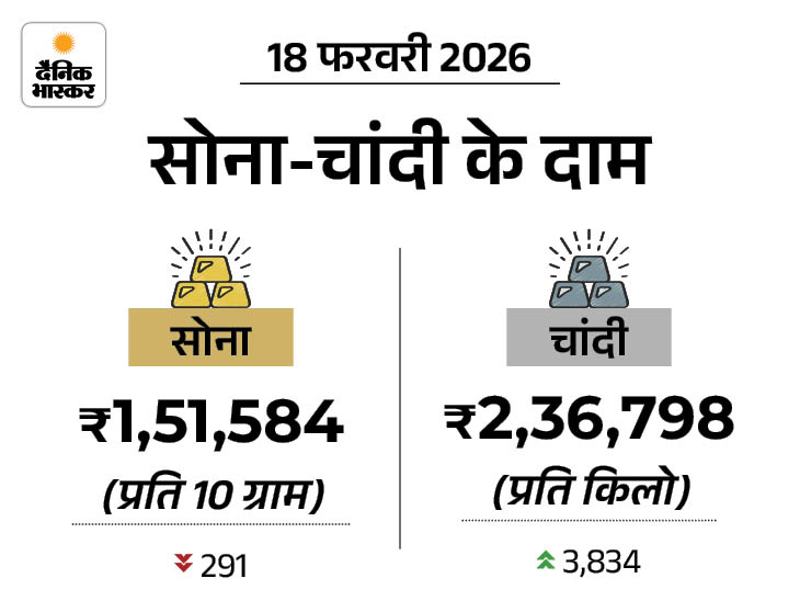 चांदी की कीमत में 18 फरवरी को बढ़त और सोने की कीमत में गिरावट है। इंडिया बुलियन एंड ज्वेलर्स एसोसिएशन (IBJA) के अनुसार, एक किलो चांदी 3,834 रुपए बढ़कर 2.37 लाख रुपए पर पहुंच गई है। इससे पहले कल ये 2.33 लाख रुपए पर थी।