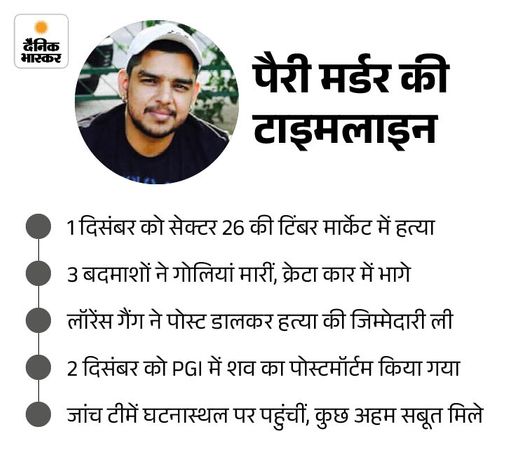 चंडीगढ़ के सेक्टर‑26 टिंबर मार्केट में सोमवार देर शाम (1 दिसंबर) कार सवार इंदरप्रीत सिंह उर्फ पैरी की गोली मारकर हत्या कर दी गई थी। इसकी जिम्मेदारी लॉरेंस गैंग ने ली थी।