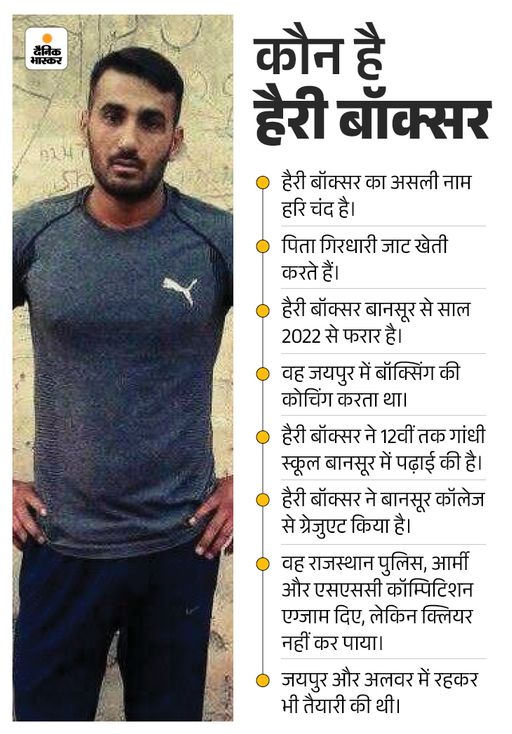 नौकरी की तैयारी की, जयपुर में बॉक्सिंग करता रहा हैरी बॉक्सर का असली नाम हरि चंद है। वह अलवर से अलग हुए कोटपूतली के गांव चतरपुरा आढी गेली का रहने वाला है। उसकी उम्र करीब 36 साल है। हैरी बॉक्सर ने 12वीं तक गांधी स्कूल बानसूर में पढ़ाई की है। उसने बानसूर कॉलेज से बीए किया है।