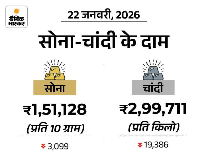 1. आज चांदी ₹19,386 और सोना ₹3,099 सस्ता हुआ: एक किलो चांदी घटकर ₹3 लाख पर आई, सोना ₹1.51 लाख/10g बिका