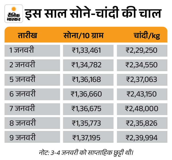 इससे पहले 29 दिसंबर 2025 को सोने की कीमत 1,38,161 रुपए प्रति 10 ग्राम के ऑल टाइम हाई पर थी। वहीं, चांदी की कीमत 7 जनवरी को 2,48,000 रुपए प्रति किलोग्राम पहुंच गई थी, जो इसके भाव का अब तक का सबसे उच्चतम स्तर है।