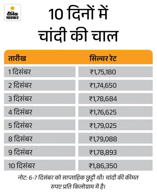 चांदी की कीमत 10 दिसंबर को 1.86 लाख रुपए किलो के ऑलटाइम हाई पर पहुंच गई है। इस साल अब तक चांदी करीब 1 लाख रुपए महंगी हो चुकी है, यानी इसकी कीमत 115% बढ़ चुकी है। एक्सपर्ट्स के अनुसार चांदी की इंडस्ट्रियल डिमांड बढ़ रही है। जिससे चांदी इस साल 2 लाख रुपए के पार जा सकती है। पूरी खबर पढ़ें