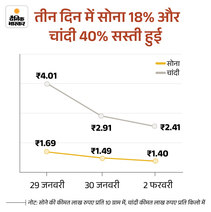 - चांदी की कीमत में 1.60 लाख रुपए की गिरावट हुई है। 29 जनवरी को ये 4.01 लाख रुपए प्रति किलो पर पहुंच गई थी, जो आज 2.40 लाख रुपए पर ट्रेड कर रही है।