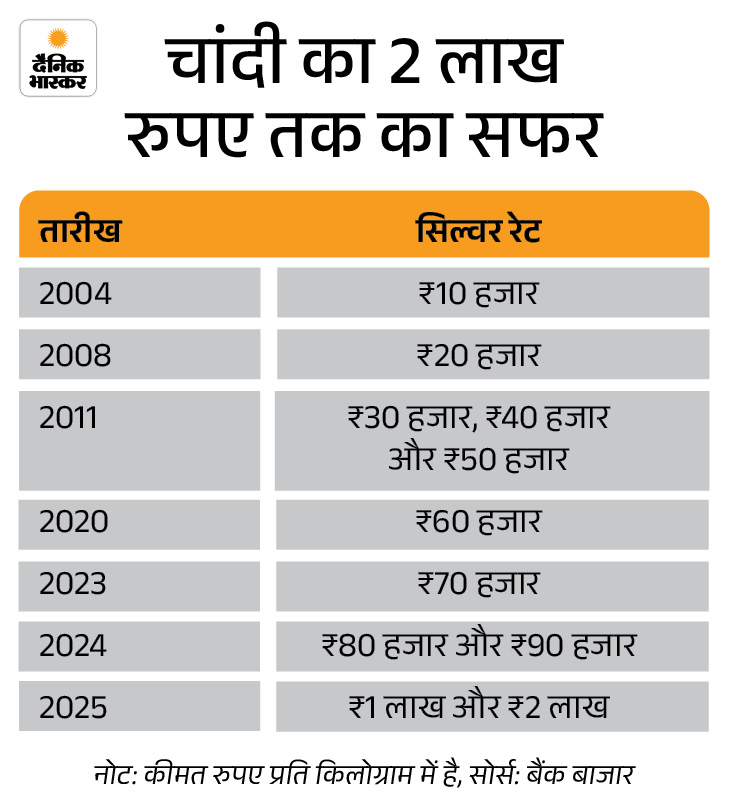 ऐसे में चांदी अगले 1 साल में 2.50 लाख तक जा सकती है। वहीं इस साल के आखिर तक चांदी की कीमत 2.10 लाख रुपए किलो पहुंच सकती है।