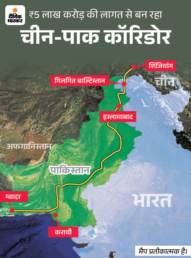 चाइना-पाकिस्तान इकोनॉमिक कॉरिडोर चीन के राष्ट्रपति शी जिनपिंग की महत्वाकांक्षी योजना है। इसकी शुरुआत 2013 में की गई थी। इसमें चीन के शिंजियांग प्रांत से पाकिस्तान के ग्वादर पोर्ट तक 60 बिलियन डॉलर (करीब 5 लाख करोड़ रुपए) की लागत से आर्थिक गलियारा बनाया जा रहा है।