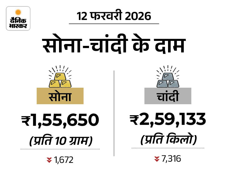 वहीं, आज 10 ग्राम 24 कैरेट सोने की कीमत 1,672 रुपए गिरकर 1,55,650 रुपए पर आ गई। इससे पहले बुधवार को ये 1,57,322 रुपए प्रति 10 ग्राम थी। सर्राफा बाजार में 29 जनवरी को सोने ने 1,76,121 रुपए और चांदी ने 3,85,933 रुपए का ऑल टाइम हाई बनाया था।