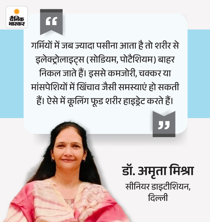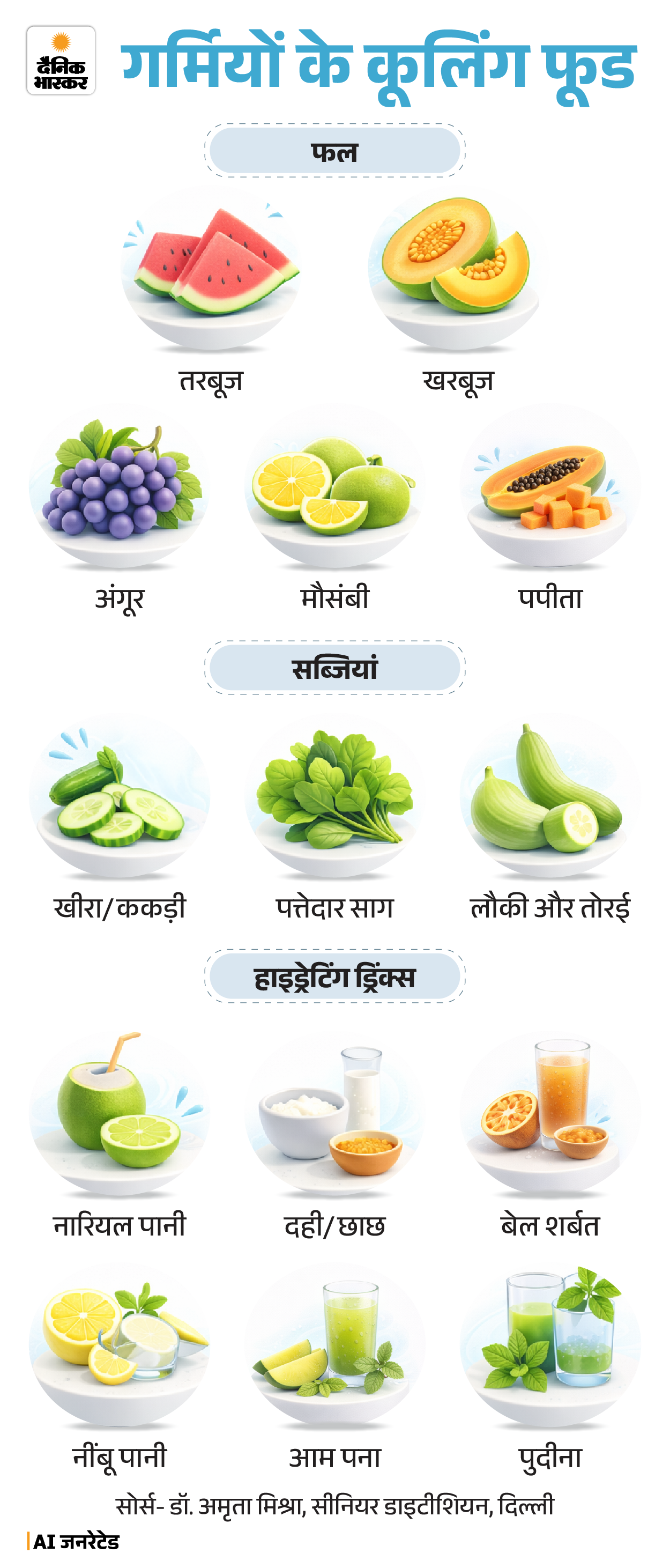 जवाब- पानी से भरपूर फूड्स शरीर में ठंडक बनाए रखने में मदद करते हैं। ग्राफिक में इनकी लिस्ट देखिए-