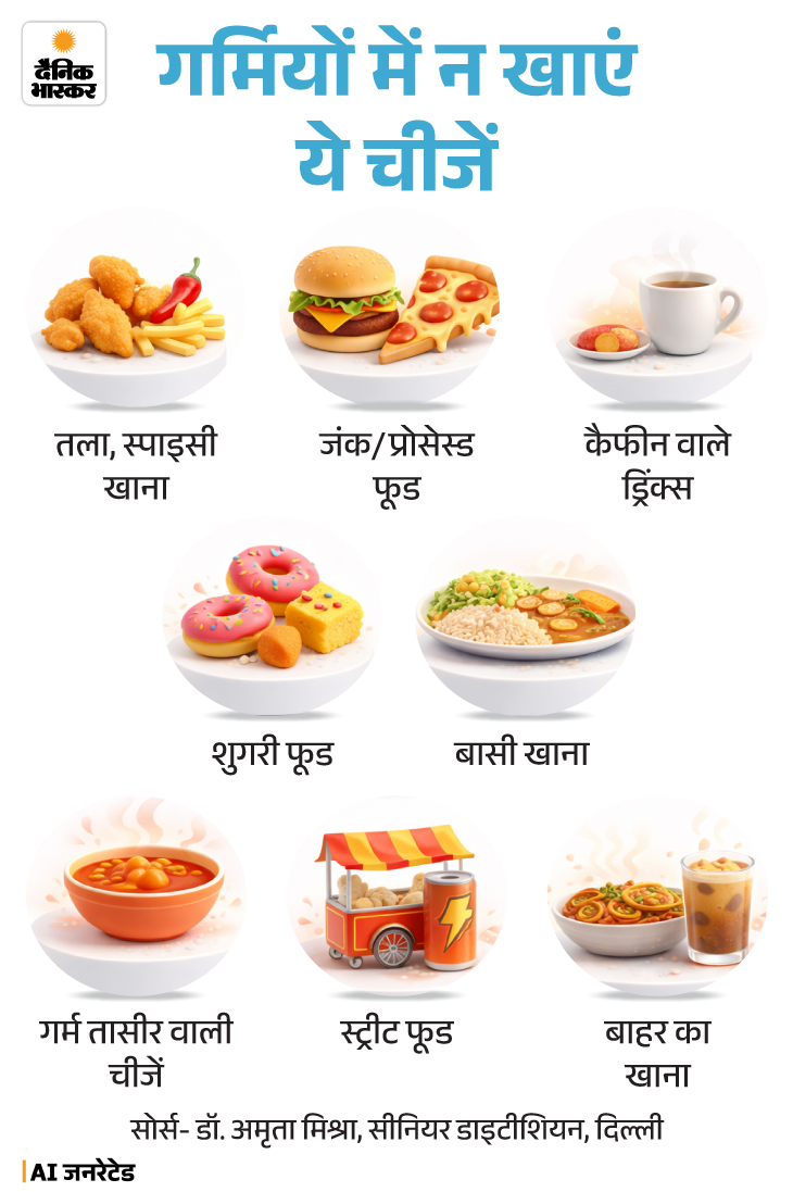 जवाब- गर्मियों में कुछ चीजें खाने से हेल्थ प्रॉब्लम्स बढ़ सकती हैं, इसलिए इन्हें खाने से बचना चाहिए। ग्राफिक में देखिए-