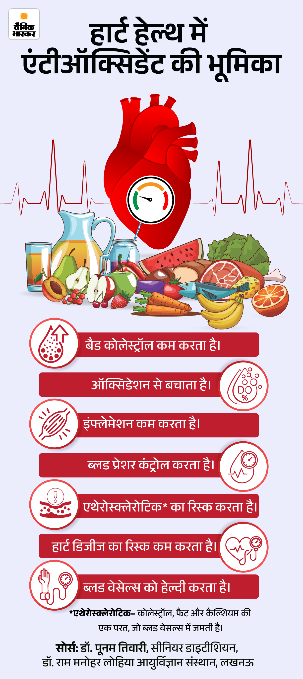 इसके कारण हार्ट अटैक का रिस्क बढ़ जाता है। एंटीऑक्सिडेंट फूड इस पूरे प्रोसेस को कंट्रोल करने में मदद करते हैं। इससे ब्लड फ्लो बेहतर रहता है और दिल पर दबाव कम पड़ता है।