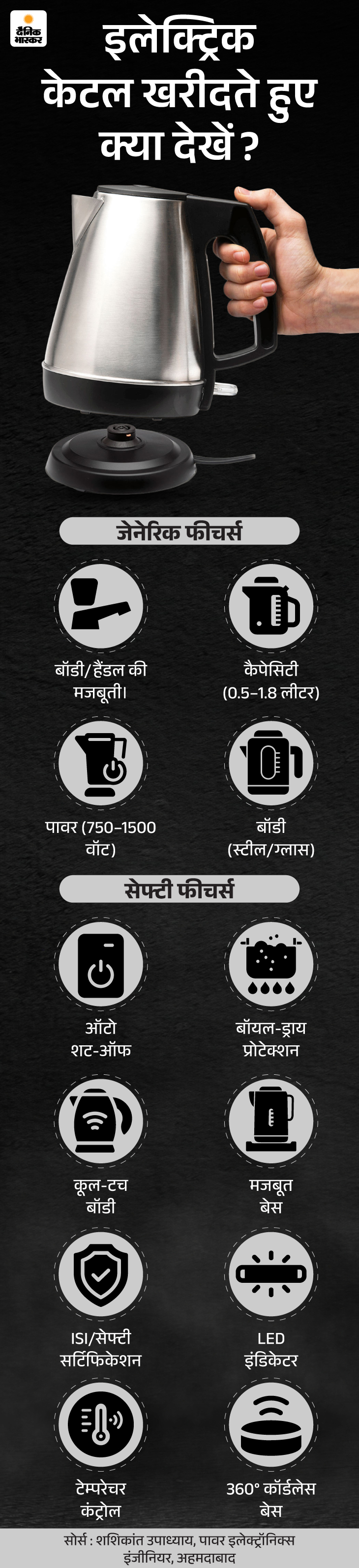 जवाब- इलेक्ट्रिक केटल खरीदते समय उसकी कैपेसिटी, मटेरियल, सेफ्टी फीचर्स, पावर, वाट और कीमत पर समेत कुछ बातों का ध्यान रखना चाहिए। इसे नीचे दिए ग्राफिक से समझिए-