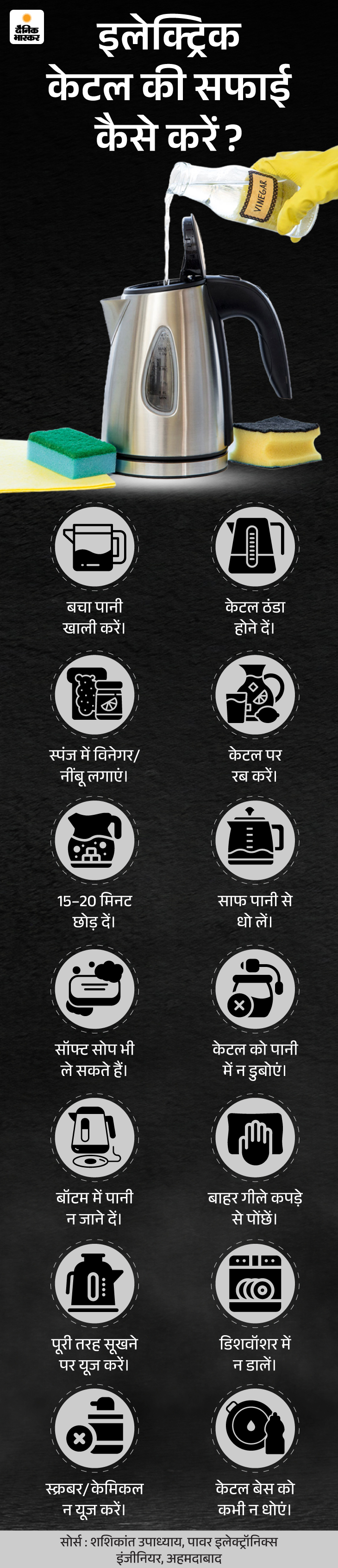 जवाब- इलेक्ट्रिक केटल की रेगलुर सफाई जरूरी है। इससे उसमें मैल या स्केल नहीं जमती और वह बेहतर परफॉर्मेंस देती है। नीचे दिए ग्राफिक से इलेक्ट्रिक केटल की सफाई का सही तरीका समझिए-