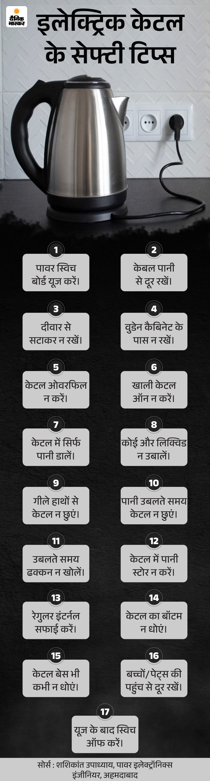 जवाब- इलेक्ट्रिक केटल का इस्तेमाल करते समय थोड़ी-सी सावधानी हमें हादसों से बचा सकती है। इसके लिए कुछ जरूरी बातों का खास ध्यान रखें। नीचे दिए गए ग्राफिक से इलेक्ट्रिक केटल के इस्तेमाल से जुड़े सेफ्टी टिप्स समझिए-