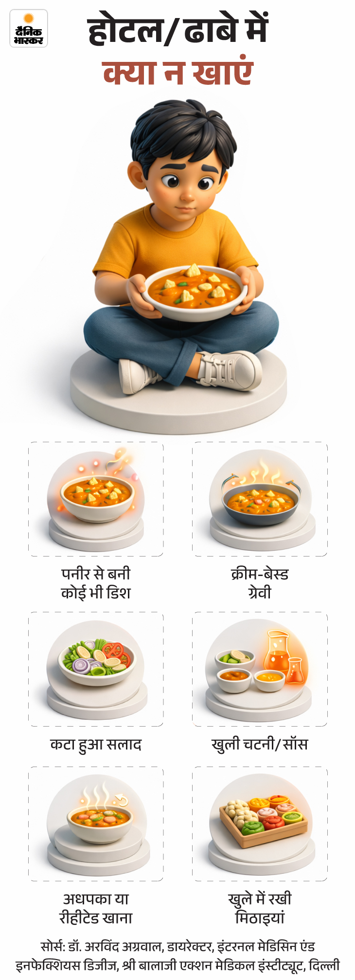 जवाब- इन जगहों पर हाइजीन का ध्यान तो रखना ही चाहिए। लेकिन साथ ही कोई भी ऐसी चीज नहीं खानी चाहिए, जिसमें पनीर हो। इसके अलावा होटल–ढाबों में न खाए जाने वाले फूड की पूरी लिस्ट ग्राफिक में देखिए–